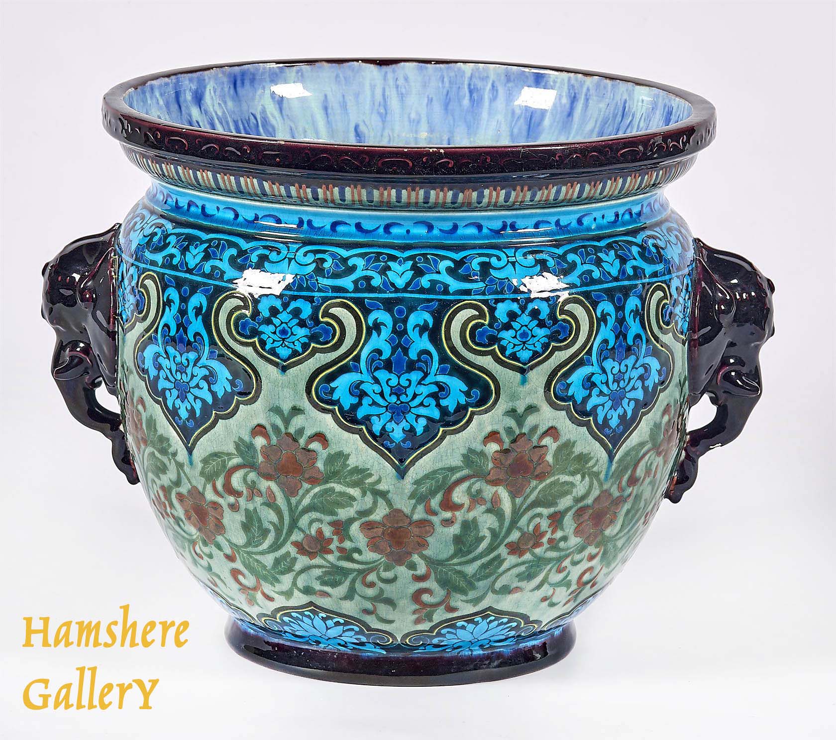 19th century, French, Persian influence, elephant earthen ware / faïence jardinière / ‘cache-pot’ by Théodore Deck for Jules Viellard & Cie Théodore Deck A rare and important, 19th century, ovoid, Persian influence, finely enamelled elephant head handles jardinière / ‘cache-pot’ with geometric, lambrequin and floral decoration by Théodore Deck for Jules Viellard & Cie of Bordeaux. French, circa 1880.