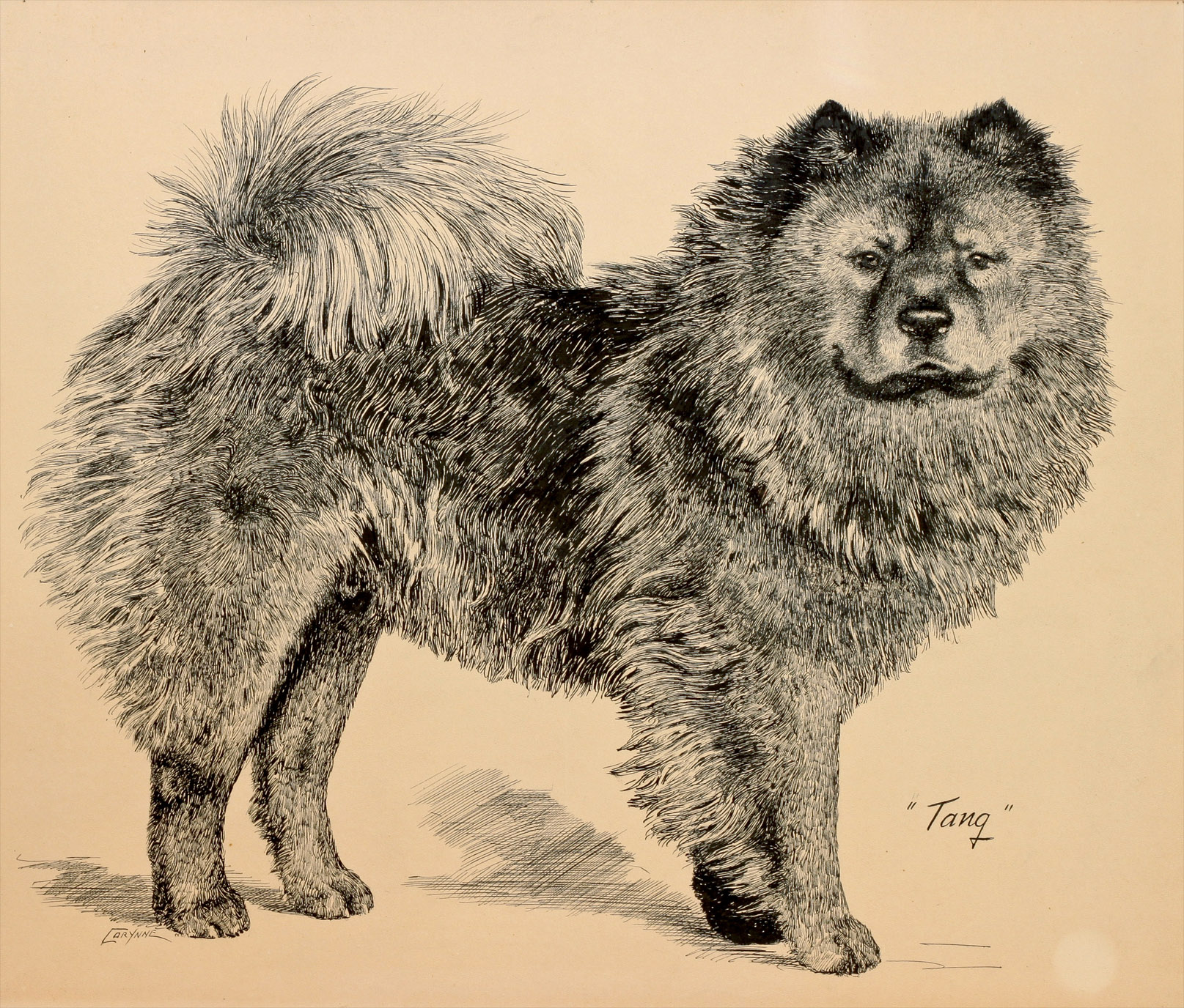 A pen and ink drawing of the Chow Chow 'Tang' by 'Carynne' A finely detailed pen and ink drawing on buff paper of standing the Chow Chow .