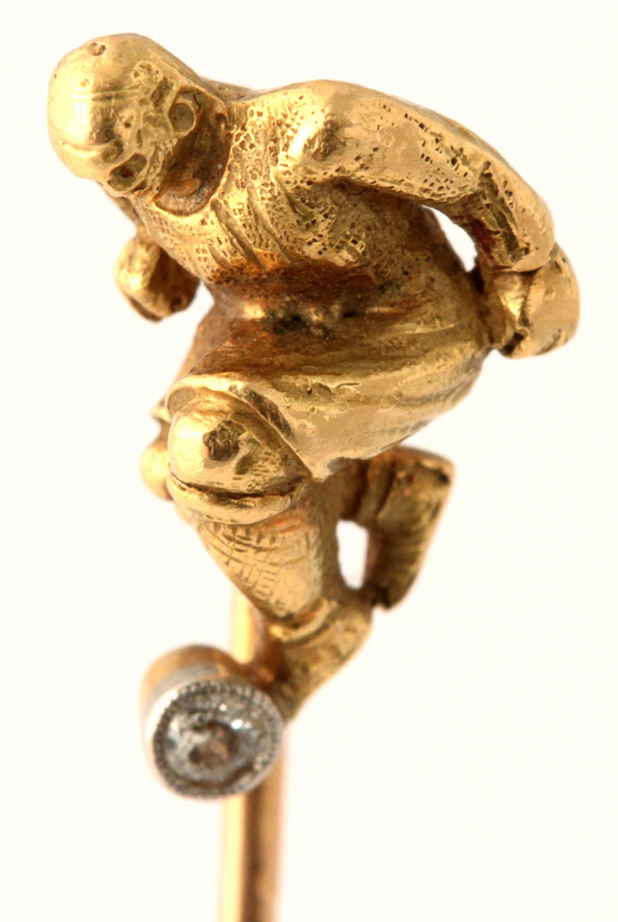 Edwardian Footballer Stick Pin The footballer kicking a millegrain platinum set diamond. English. 18 carat gold.