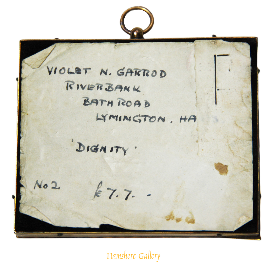 To the reverse the remnants of an old exhibition label, and the ink inscription 'VIOLET N GARROD RIVERBANK, BATH ROAD, LYMINGTON, HANTS' and titled 'DIGNITY' and priced No 2 7.7