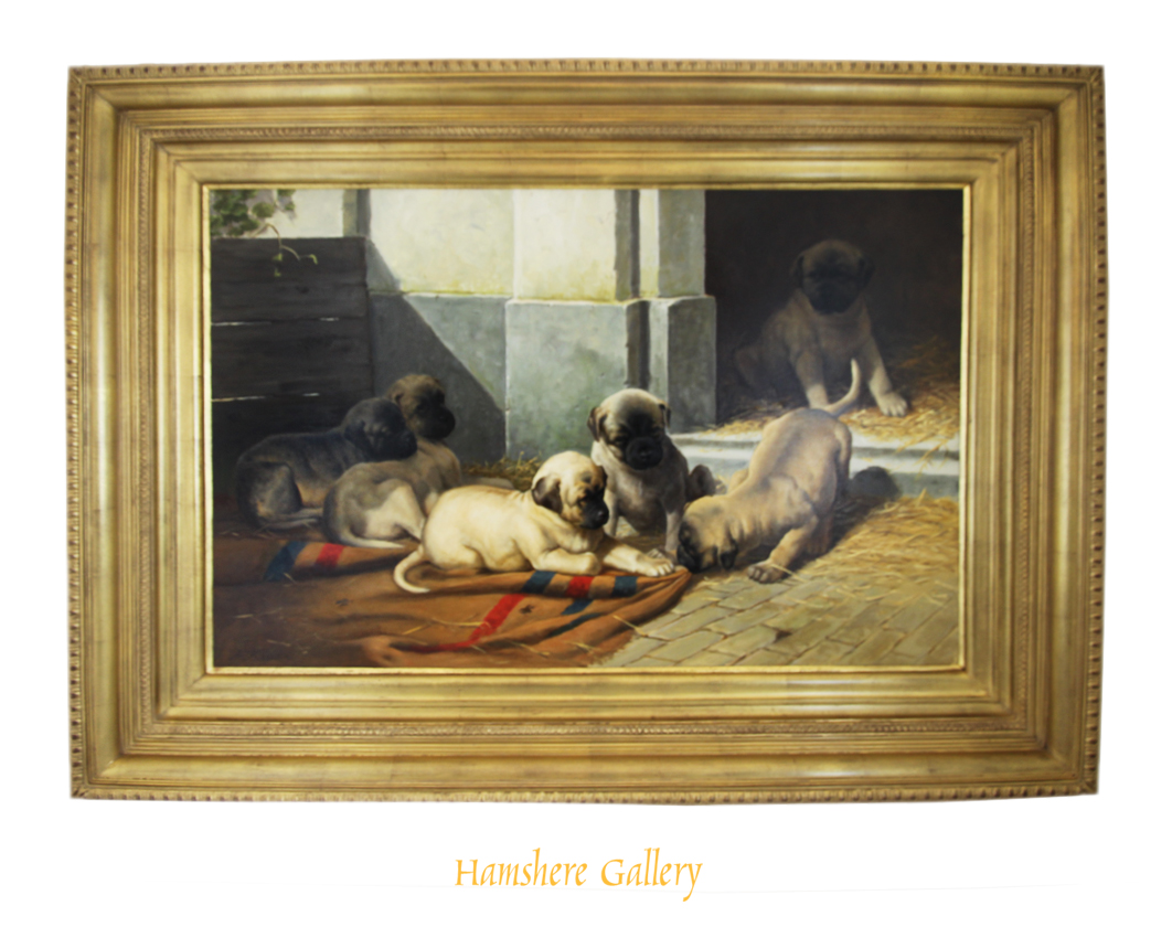 Pug puppy oil by Anton Karssen (Dutch, b. 1945) An oil on canvas of mother observing her five Pug puppies at play in a yard by Anton Karssen (Dutch, b. 1945). Signed bottom left “A Karssen”. Dutch, circa 2000.