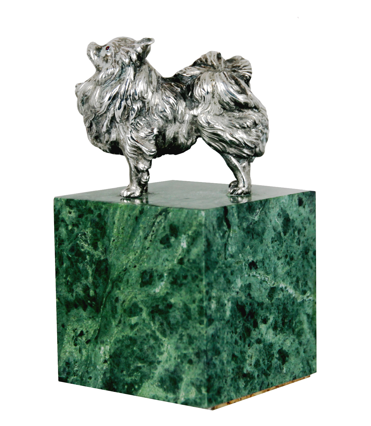 An English 1920’s Pomeranian paperweight by John Henry Hill An English 1920’s silver Pomeranian standing on a green marble base, modelled as a paperweight. Ruby glass eyes. Assayed on the tail London 1923 with the London makers mark of John Henry Hill. English 1923.
