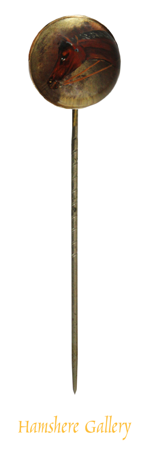A circular reverse intaglio 9 carat gold set crystal stick pin of a study of a bridled horses head. Reverse intaglio crystals are commonly and erroneously often called Essex Crystals. Circa 1900.