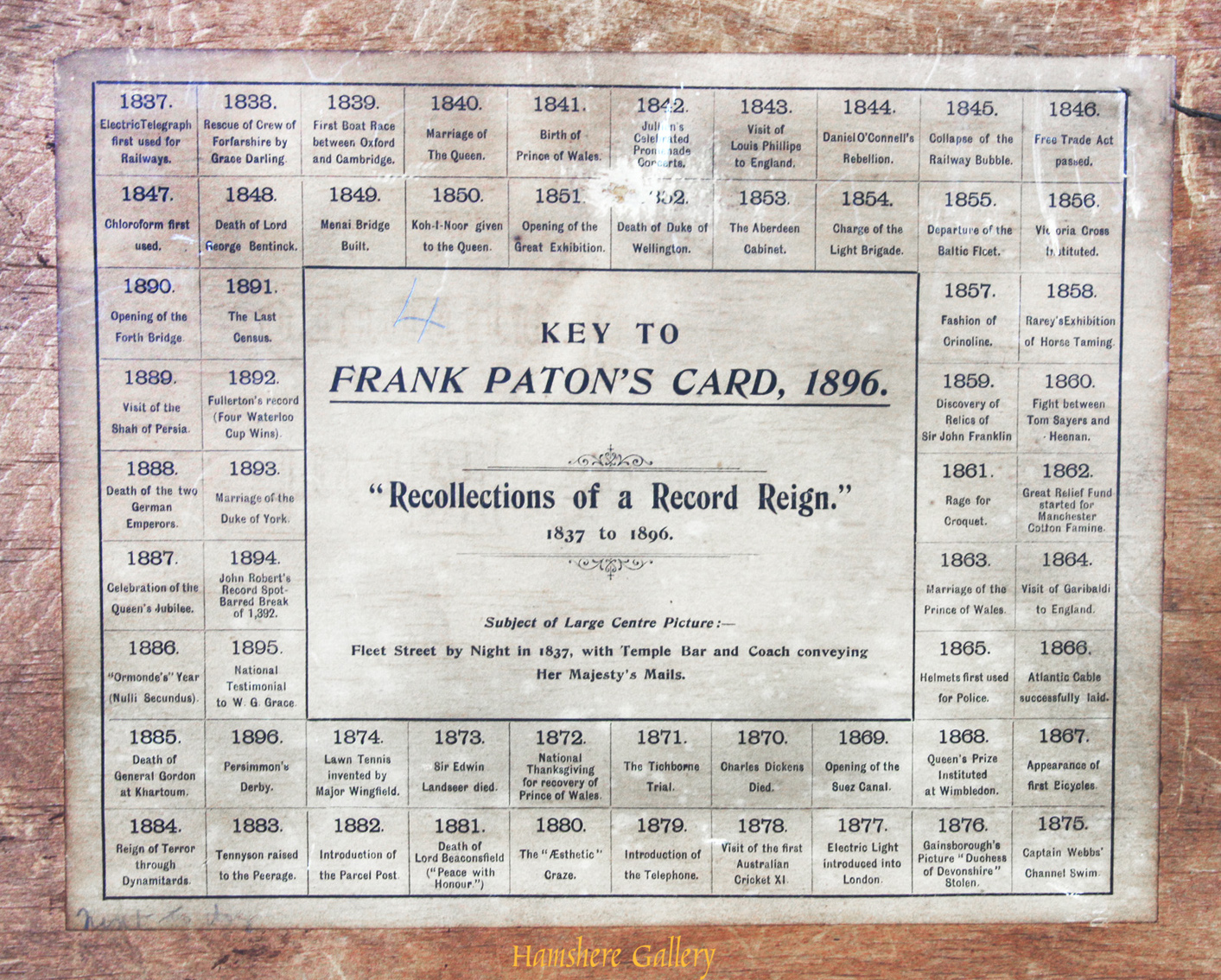 "Recollections of a Record Reign" dry point etching of a coach passing through Temple Bar, London by Frank Paton (English, 1856-1909) An artist proof dry point etching titled "Recollections of a Record Reign" by Frank Paton (English, 1856-1909). A coach passing through Temple Bar, London. It had been dismantled very carefully in 1878 and was rebuilt in Paternoster Square in 2004. The central image is surrounded by vignettes representing each year of Victoria's reign until 1896, the year of her Diamond Jubilee. These include: portraits of Prince Albert, Wellington, Disraeli, Dickens, W.C. Grace, Edwin Landseer; and other's of the Queens favourites and buildings including St Paul's Cathedral, the Forth Railway Bridge and the Crystal Palce; and inventions including chlorogorm for surgery, dynamite, telephones and bicycles.