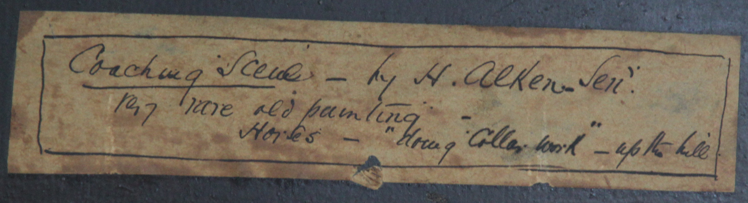 Coaching oil “Doing Collar Work†by Henry Thomas Alken Snr. (English, 1785 – 1851) An oil on panel of a coach fully laden with passengers and luggage following an incline as it approaches a thatched cottage. by Henry Thomas Alken Snr. (English, 1785 – 1851). The coach wearing the correct Royal Mail livery, black with red door and lower panels, Post Office red wheels, and The Royal Coat of Arms on the door with the name of the town at the end of the coach’s route. The reverse bears ink label “Coaching Scene A Alken Sen. Very rare old painting. Horses - "doing Collar work" up the hillâ€. Monogrammed and dated on the milestone “1815â€. English, 1815. This is a SOLD item and has been left in the Public Domain for research purposes. Images are available for public use with an acknowledgement to www.hamsheregallery.com