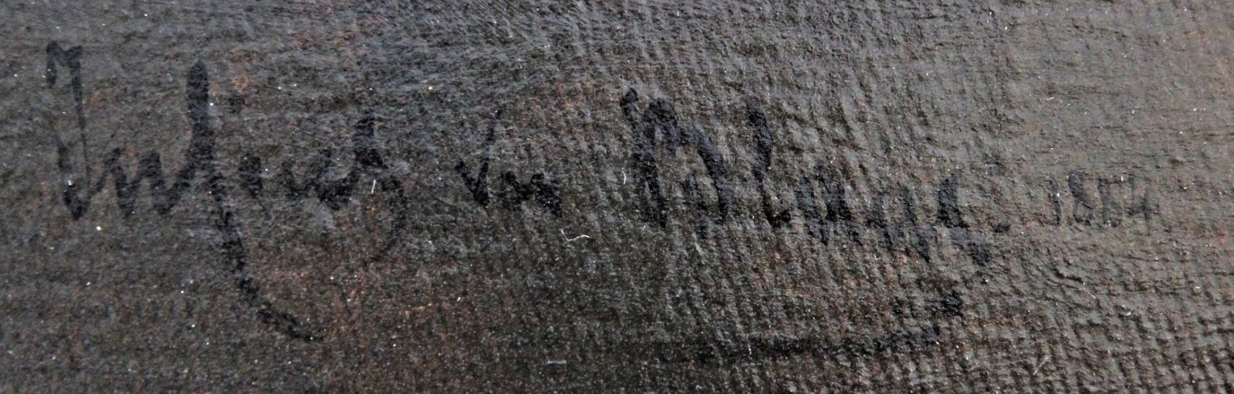 An oil painting depicting the head of a dapple grey horse, inquisitive with a pair of fawn Pugs by Julius von Blaas (Italian / Austrian 1845–1923). Signed and dated top left “Julius von Blaas 1884”. The reverse bears gallery label for Colin Stodgell Fine Art , 2B Pavor Road Torquay. A similar composition by von Blaas was sold at Bonhams New York “Dogs In Show And Field” on 17th February 2016, lot 154.
